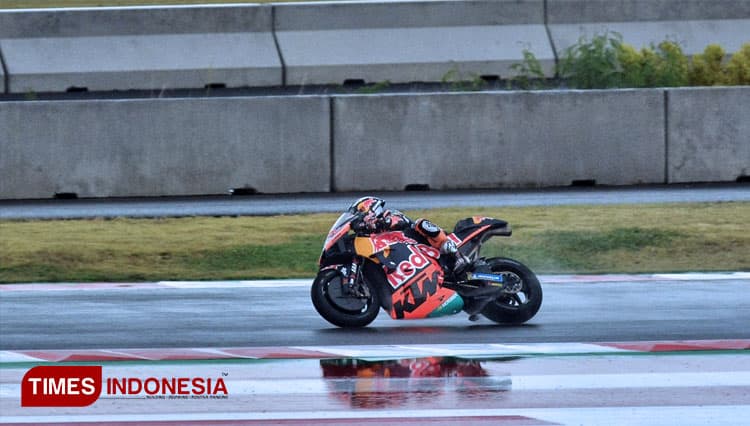 TIMES Manukwari/Pembalap tim Red Bull KTM, Miguel Oliveira melahap trek basah Sirkuit Mandalika, saat lomba seri kedua MotoGP di Mandalika, Lombok, NTB, Minggu (20/3/2022). (FOTO: Tria Adha/TIMES Indonesia)