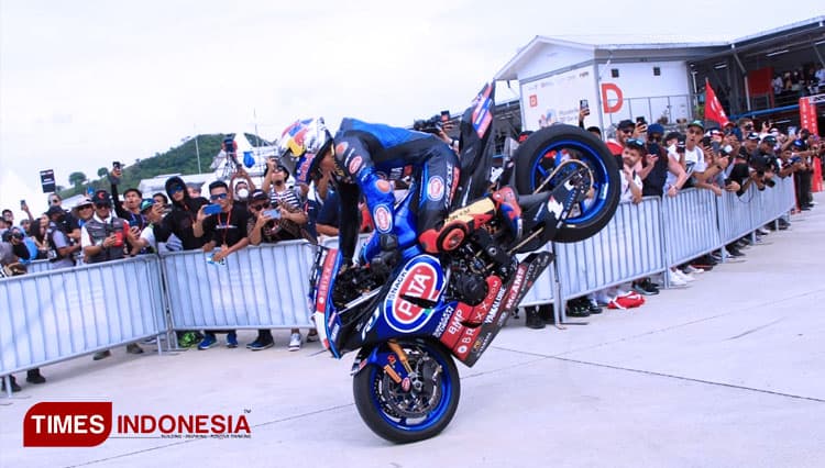 TIMES Manukwari/Pembalap PATA Yamaha Brixx Toprak Razgatlioglu melakukan atraksi stopie ban depan usai memenangi race 1 WSBK Mandalika 2022, Sabtu (12/11/2022). (FOTO: Tria Adha/TIMES Indonesia).